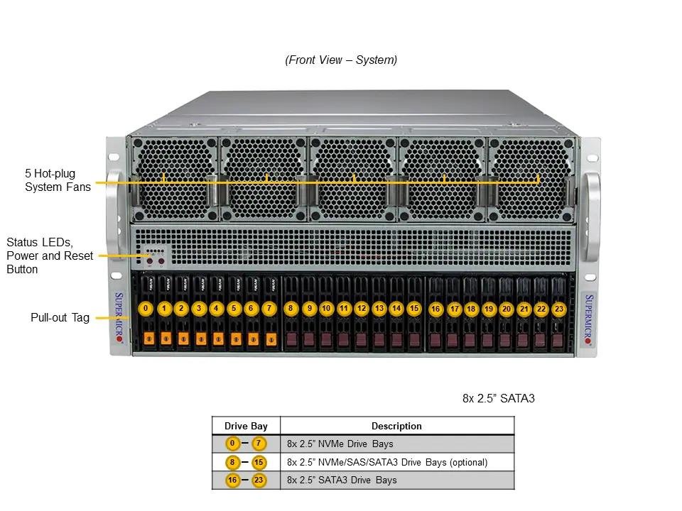 - 24x 2.5" hot-swap NVMe/SATA/SAS drive bays (8x 2.5" NVMe hybrid; 8x 2.5" NVMe dedicated)