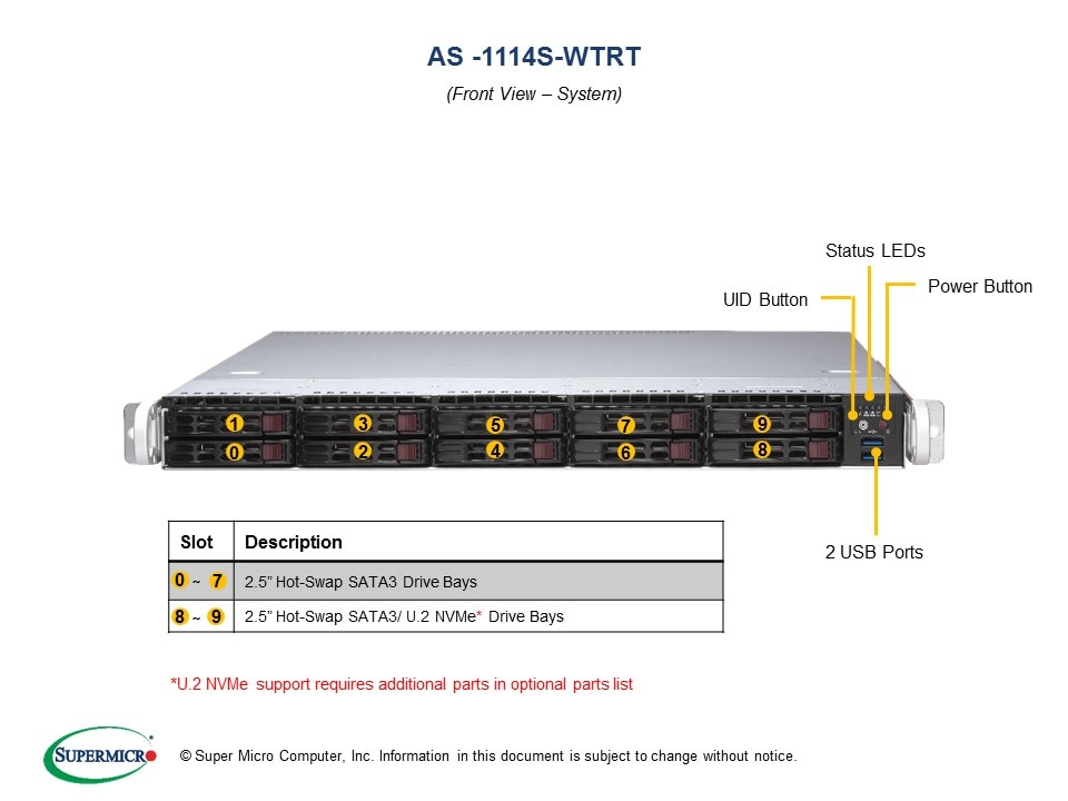 (SFT-OOB-LIC) included for OOB BIOS management - 10 Hot-swap 2.5" SATA3 drive bays, Optional 2 U.2 NVMe (PCI-E 3.0) drive support via additional kit for NVMe devices