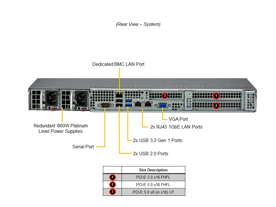1 x PCIe 5.0 x8 (in x16) LP slot(s) - Onboard 1G LAN ports (Intel® i210), 1 dedicated IPMI LAN