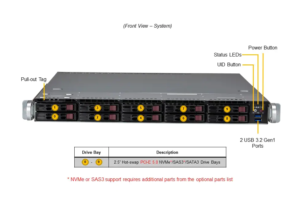 - 10 x 2.5" hot-swap NVMe/SATA/SAS drive bays;NOTE: SAS card is required for SAS devices support