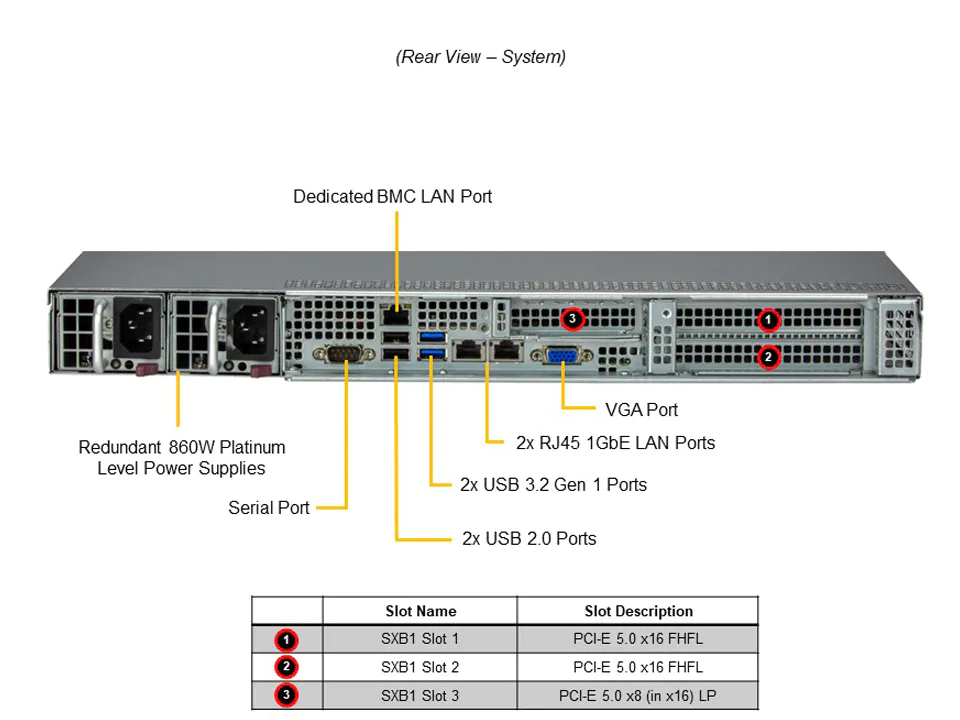 1 x PCIe 5.0 x8 (in x16) LP slot - Onboard 1G LAN ports (Intel® i210), 1 dedicated IPMI LAN