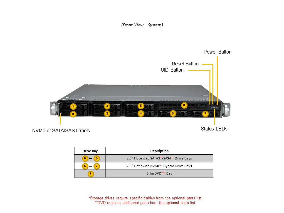 Complete System Only: To maintain quality and integrity, this product is sold only as a completely-assembled system (with Minimum 2 CPUs, 4 DIMMs and 1 Storage Device HDD/HDS/M.2, and 1 NIC).NIC requirement can either be AIOM or PCIe card.