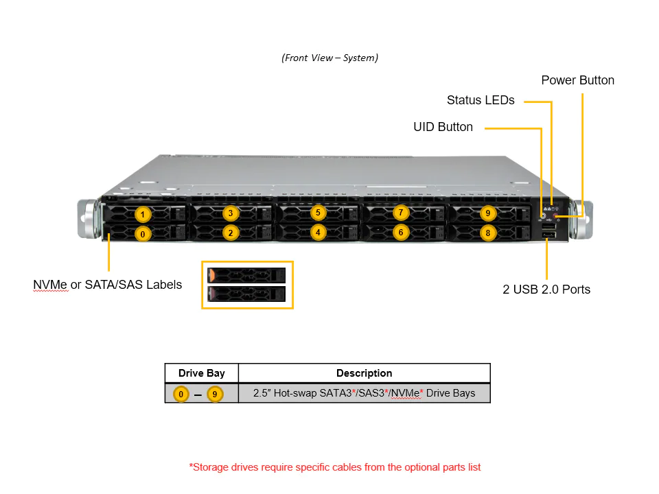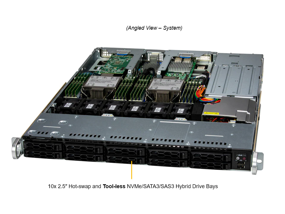 • 10 x 2.5" hot-swap NVMe/SATA/SAS hybrid drive bays
