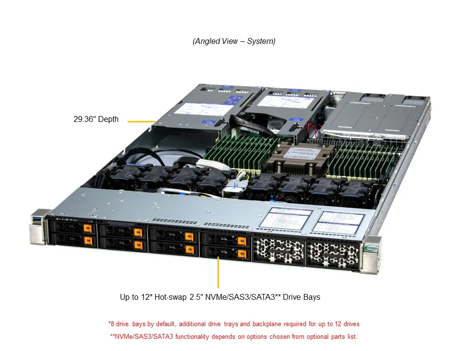 12 DIMM slots with 1 DIMM per channel (up to 3TB DDR5-4800MHz) - 8 Hot-swap 2.5” NVMe/SAS/SATA (Option for up to 12 drives)