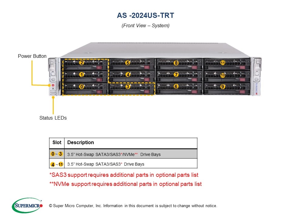 - 12 hot-swap 3.5" Drive Bays: 12 SATA3 by default or 8 SATA3 + 4 NVMe via optional tray or 12 SAS3 via optional SAS kit