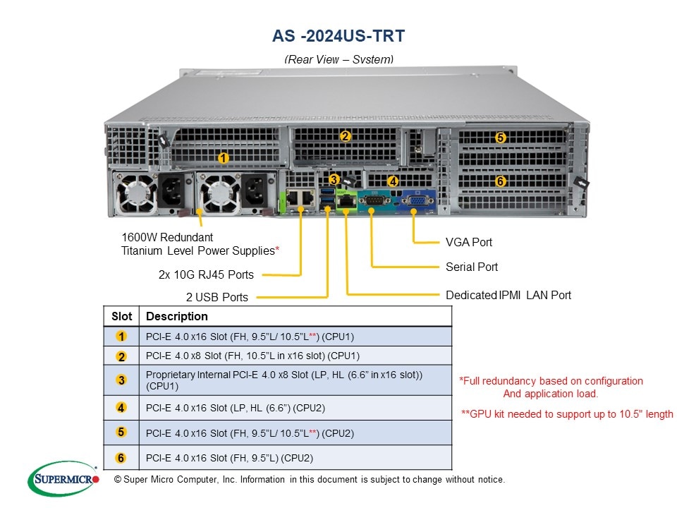 - 2 PCI-E 4.0 x16 (FH, 10.5" L) slots, 1 PCI-E 4.0 x16 (FH, 9.5" L) slot, 1 PCI-E 4.0 x16 (LP) slot, 1 PCI-E 4.0 x8 (FH, 9.5" L, in x16) slot, 1 PCI-E 4.0 x8 (internal proprietary LP in x16) slot