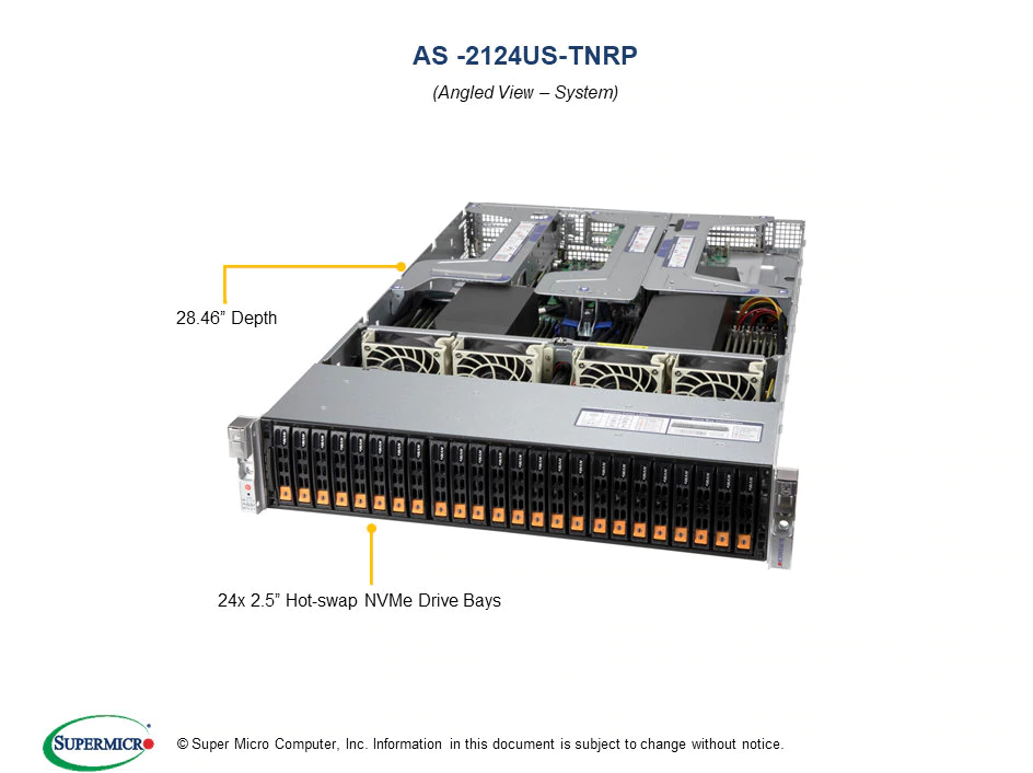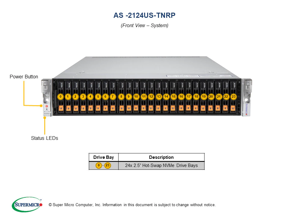- Drive Bays: 24 hot-swap 2.5" U.2 NVMe drive bays, up to 24 SATA/SAS drive support via optional SAS kit