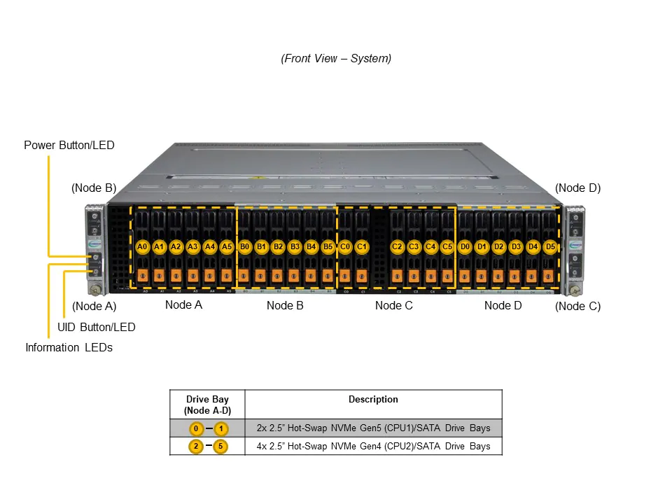 - 6x 2.5" hot-swap NVMe/SATA drive bays ( 2x PCIe 5.0 NVMe and 4x PCIe 4.0 NVMe/SATA)