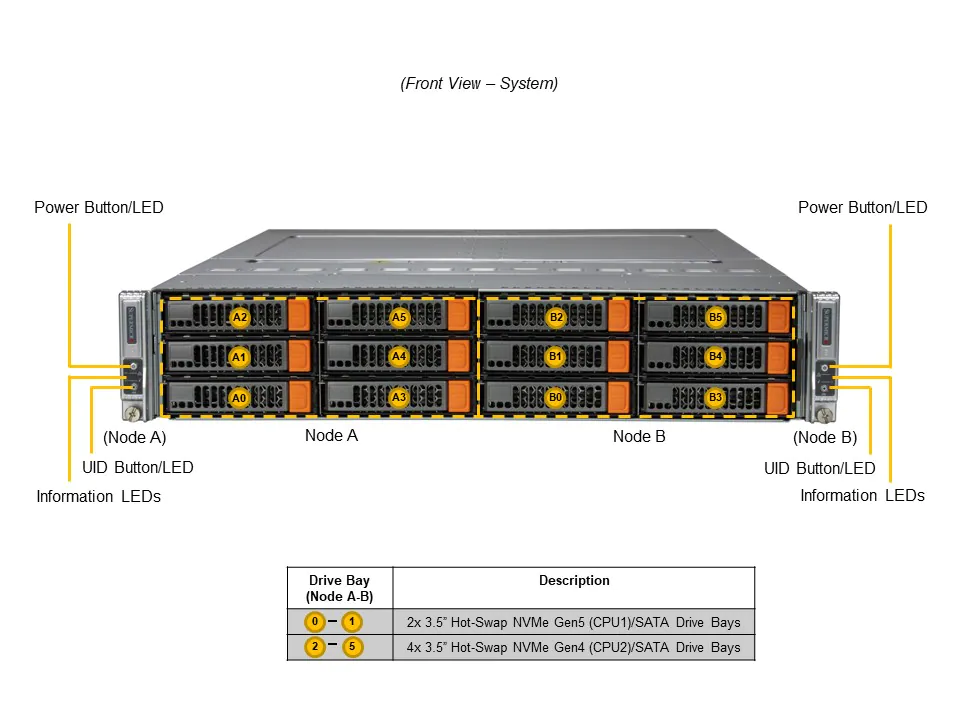 - 6x 2.5" hot-swap NVMe/SATA drive bays ( 2x PCIe 5.0 NVMe and 4x PCIe 4.0 NVMe/SATA)