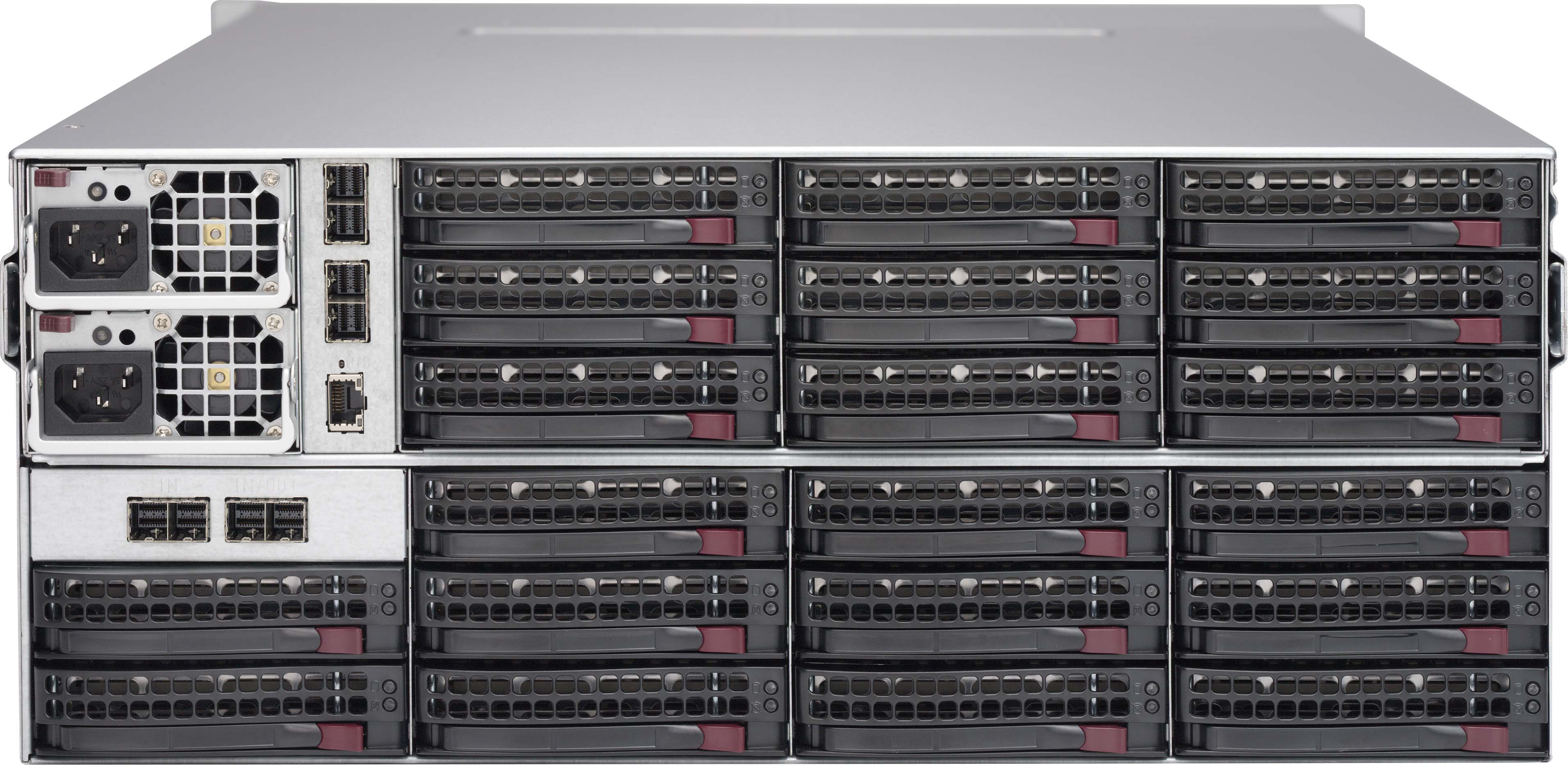 - 44x (24 front + 20 rear) 3.5" hot-swap SAS/SATA drive bays supporting SAS3/2 or SATA3 HDDs with 12Gbps throughput