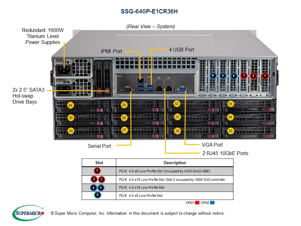 PCIe slot 1&2 are occupied by the JBOD Expansion/Storage Controller - 36 3.5"/2.5" Hot-swap SAS3/SATA3 drives (4 Hybrid NVMe), 2x Rear SATA Slots,
