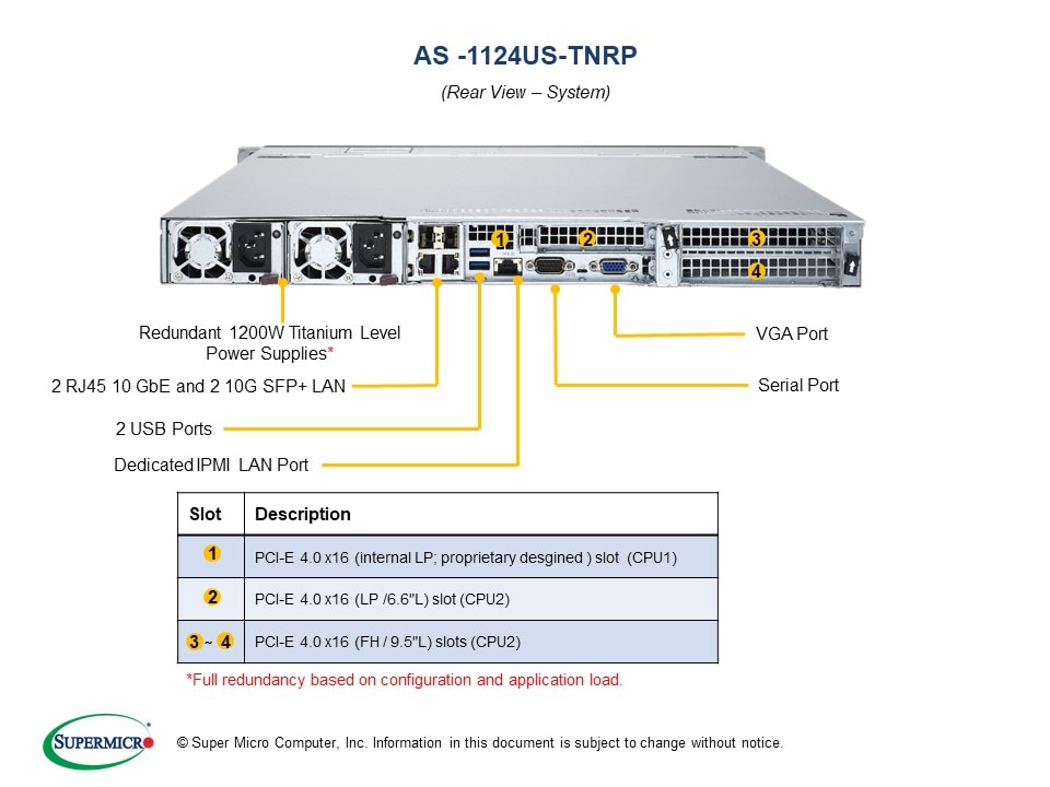 - 2 PCI-E 4.0 x16 (FH, 9.5"L), 1 PCI-E 4.0 x16 (LP), 1 PCI-E 4.0 x16 (internal proprietary LP slot)
