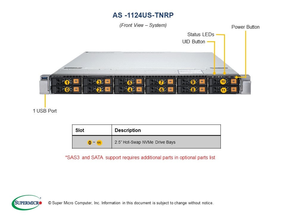 - Drive Bays: 12 Hot-swap 2.5" U.2 NVMe drive bays or SATA3/SAS3 (via optional SAS kit)