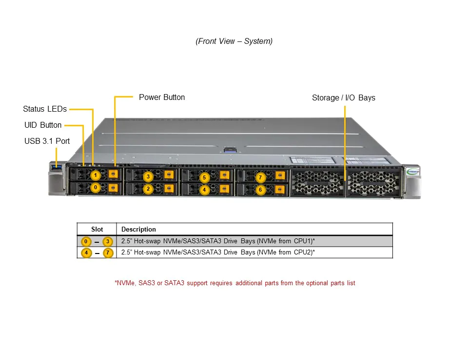 - 8x 2.5" hot-swap NVMe/SATA/SAS drive bays;