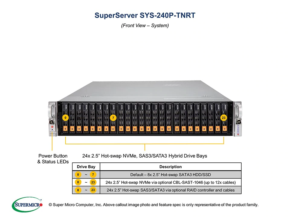 - Up to 24 Hot-swap 2.5" NVMe/SAS3/SATA3 drive bays (Default with 8 SAS3/SATA3 drive bays);