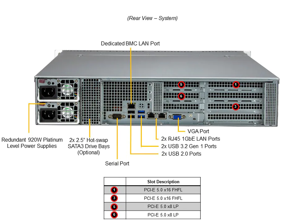 2 x PCIe Gen5 x8 LP slot(s) - Onboard 1G LAN ports (Intel® i210), 1 dedicated IPMI LAN